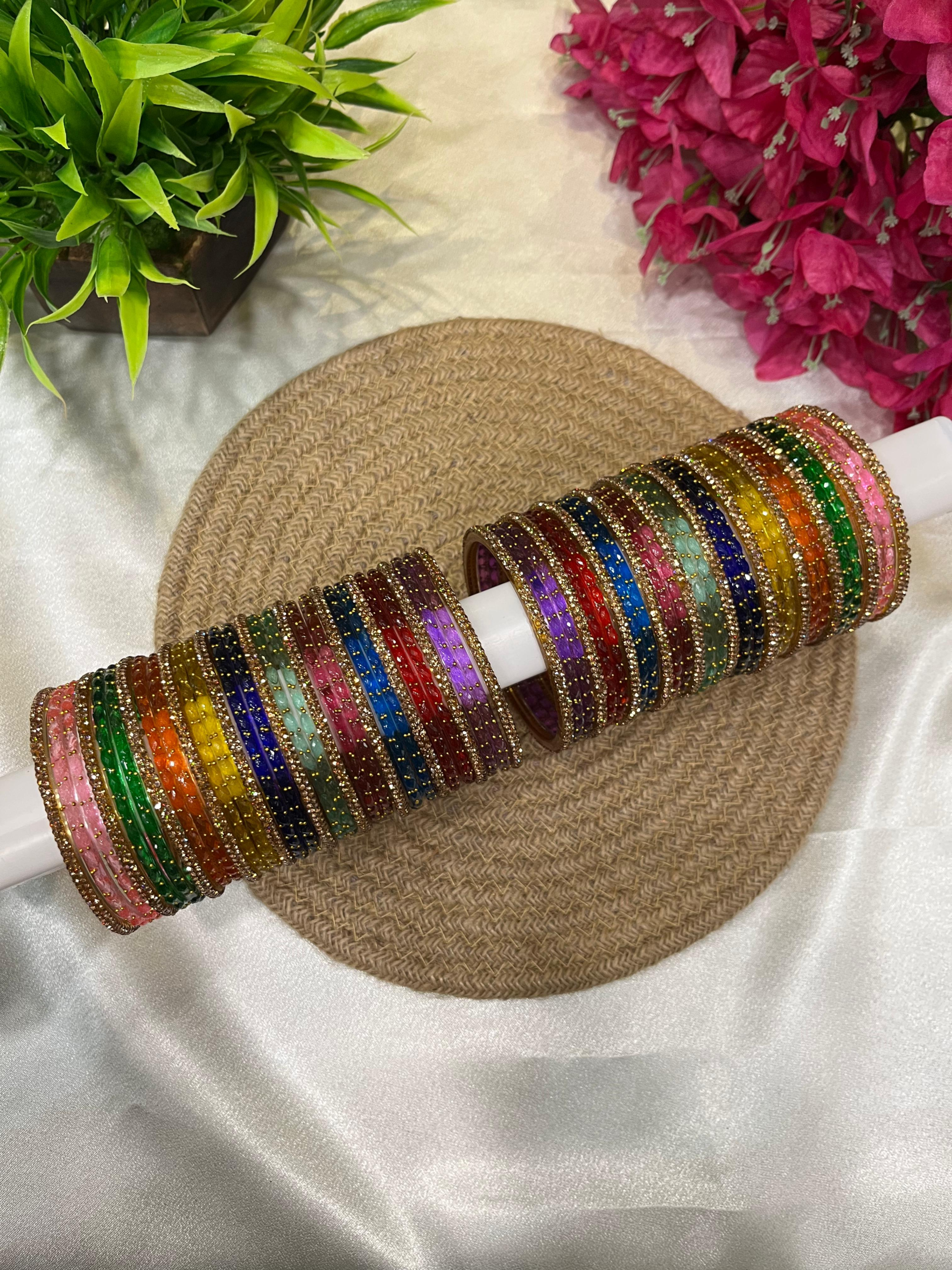 Contains a premium assortment of glass bangles in coordinated colors